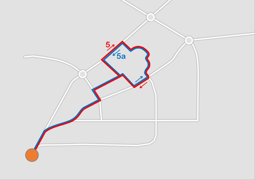 Firstly I should help you by explaining the scenario as I first encountered it. As part of a city network there was one estate, sandwiched between major trunk roads, being served by 2 circular routes. The service 5 & 5a each operated with a 30mins headway that combined to create a 15mins headway from the City to the estate.