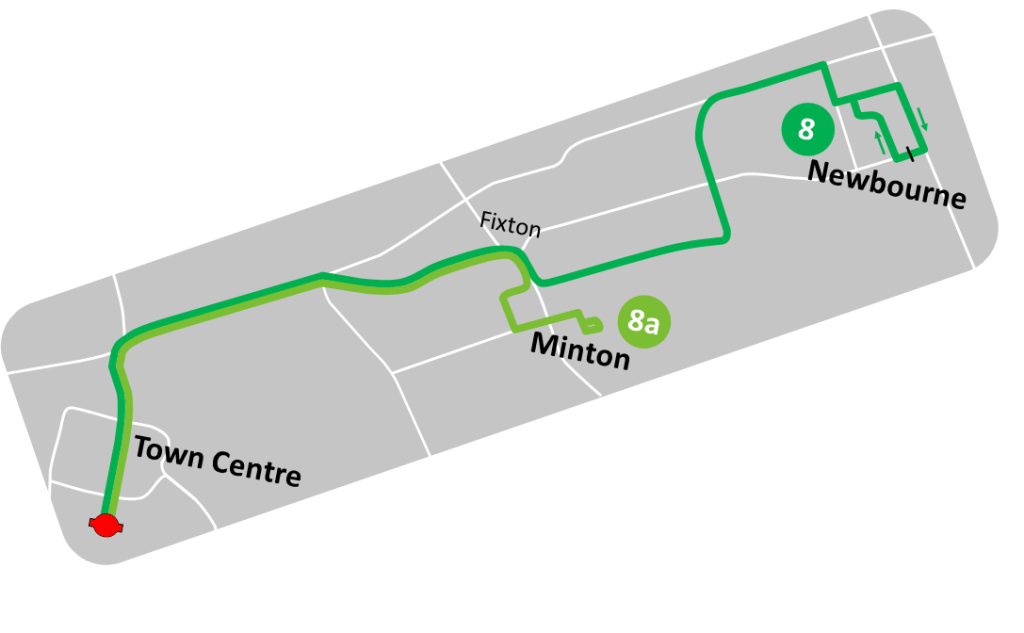 Service No. 8a operates between Town Centre and Minton via Fixton